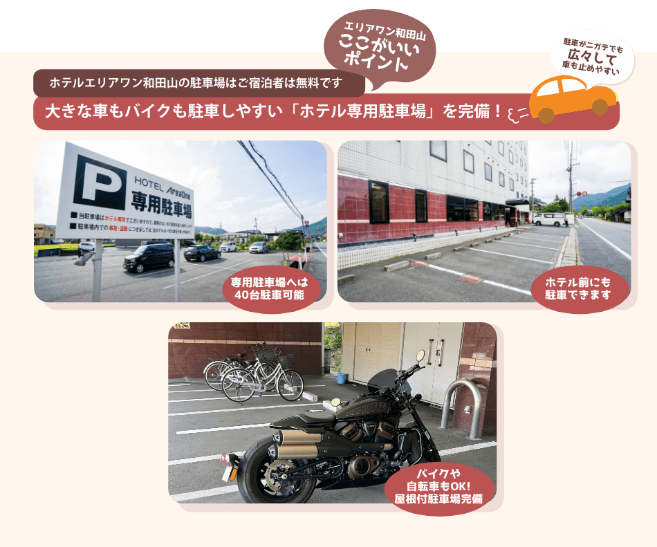 ホテル玄関前、ホテル前(合計40台駐車可能)※先着順
